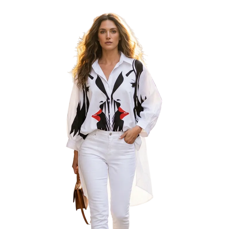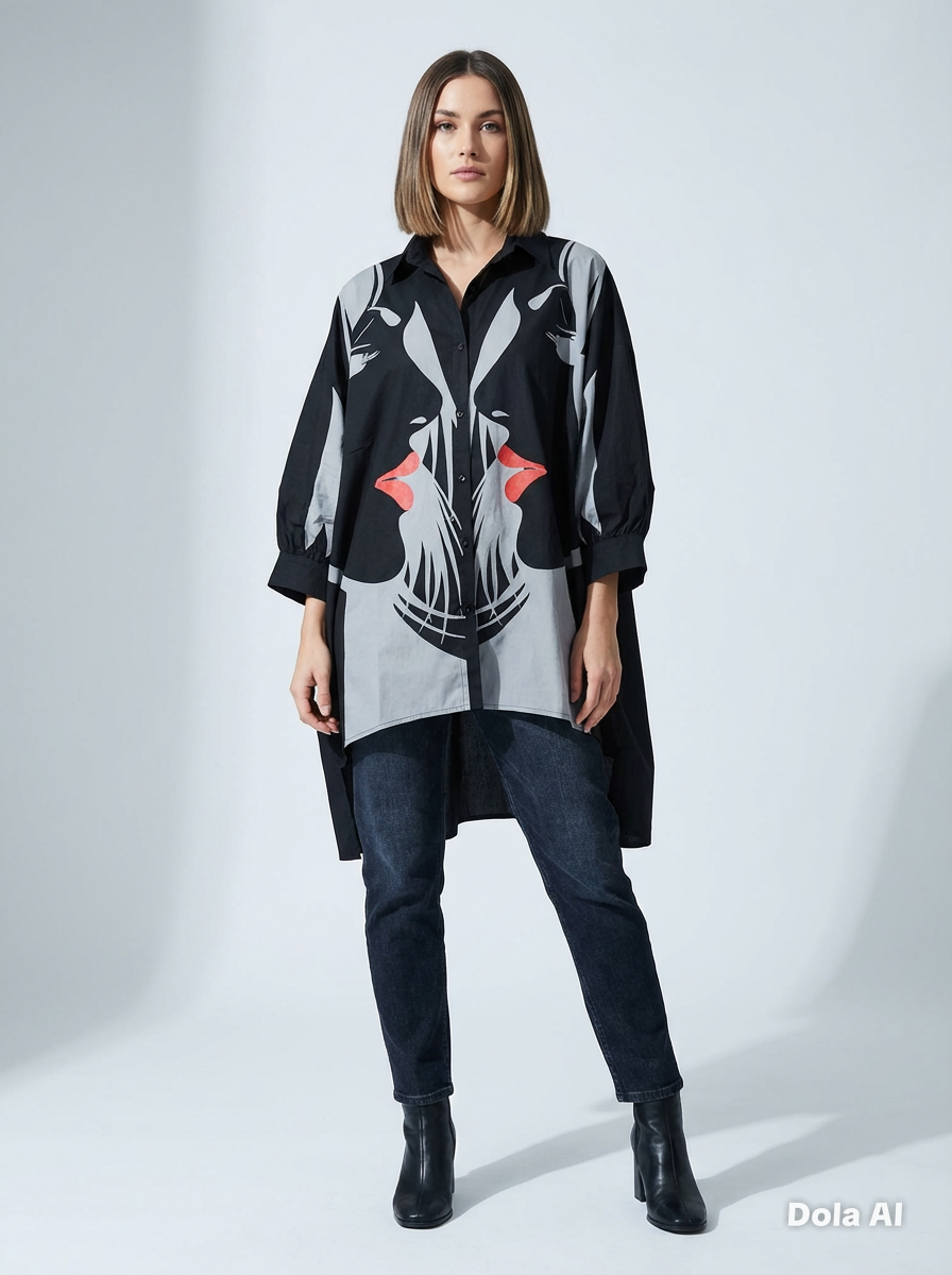 "This oversized balloon sleeve shirt features a bold face print on the front, offering a unique and stylish look. Made from soft, comfortable fabric, it combines a relaxed fit with eye-catching design, perfect for a statement piece in any casual wardrobe."